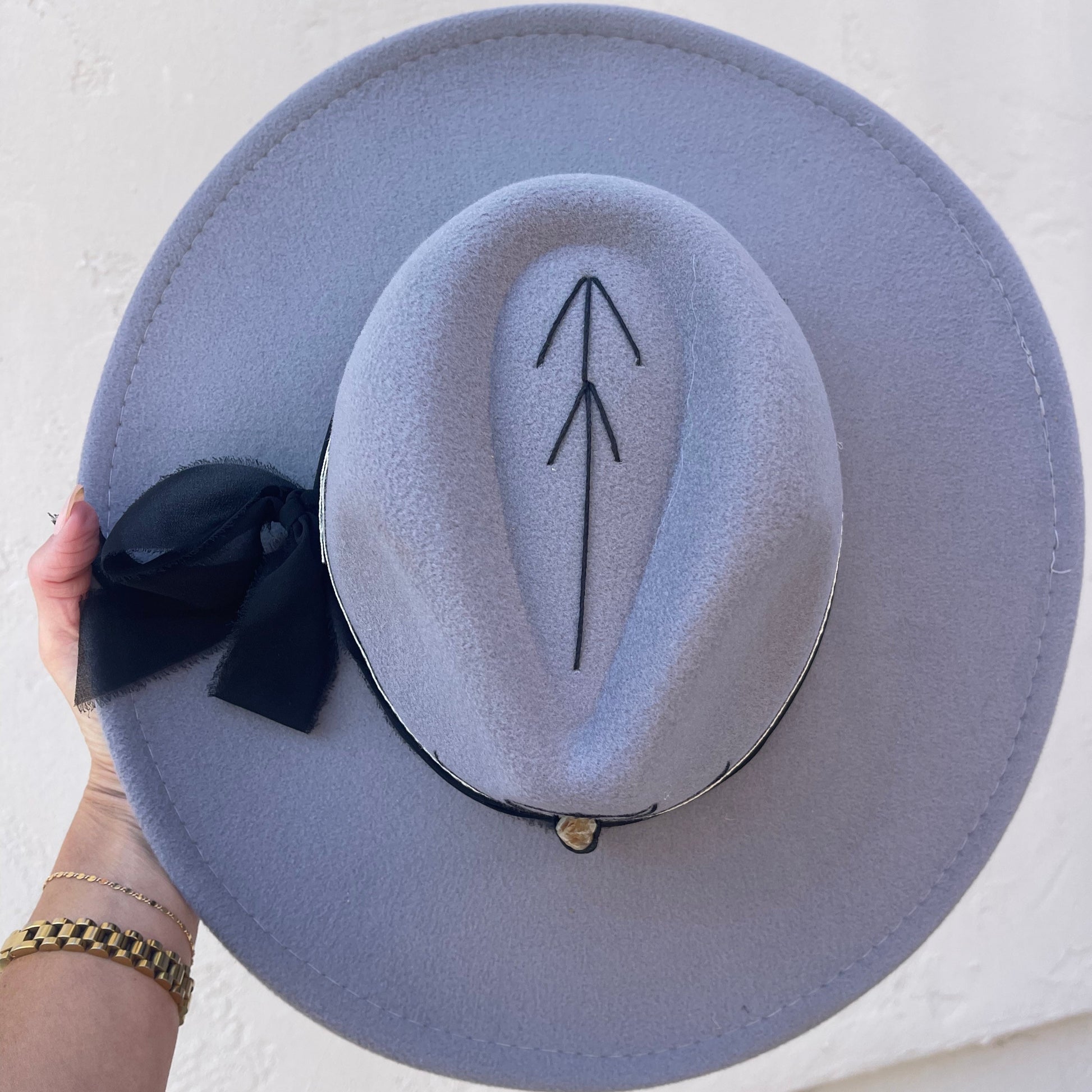 A hat that speaks to the soul. Seta da Alma (“Arrow of the Soul” in Portuguese) is a wide-brim felt fedora featuring hand-stitched linear embroidery that symbolizes alignment and direction. An upward arrow graces the crown, while structured rays fan outward from a Citrine, grounding the design in balance and clarity. Finished with a black/white band, this piece blends earthy elegance with spiritual intention — a statement hat for the free-spirited dreamer who walks her own path.