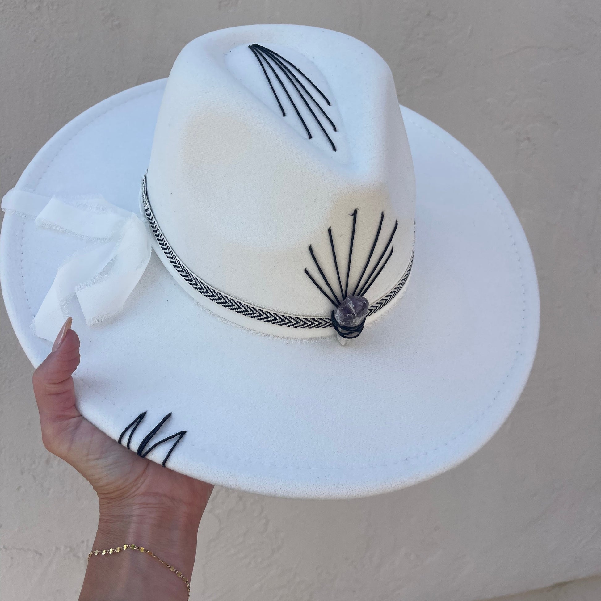 A luminous expression of soul and spirit. Ray of Alma (“Ray of the Soul” in Portuguese) is a wide-brim felt fedora adorned with hand-stitched embroidery that cascades across the crown like radiant beams of light. Each stitch symbolizes clarity and direction, converging at an Amethyst that grounds the design in calmness and balance. Finished with a white & black band, this piece radiates both elegance and intention — a hat for the free-spirited dreamer who walks boldly toward the light.