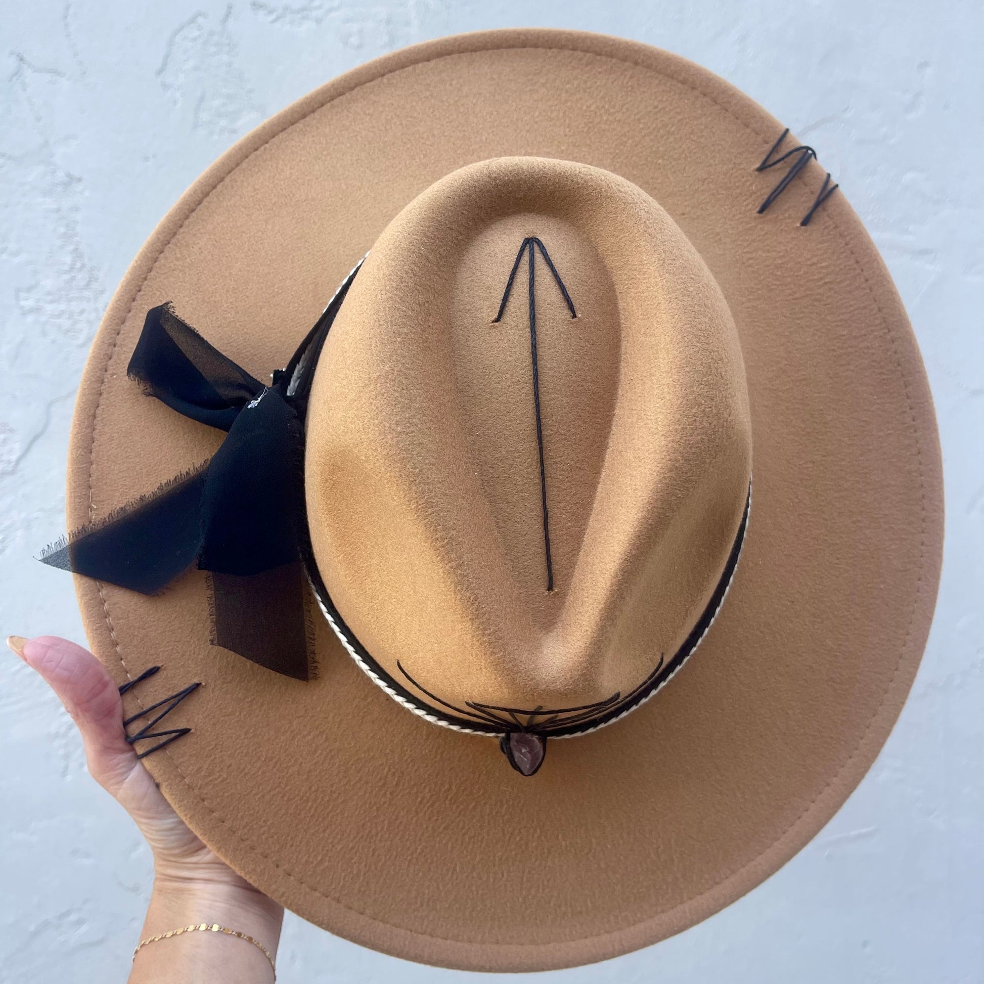 A hat that speaks to the soul. Seta da Alma (“Arrow of the Soul” in Portuguese) is a wide-brim felt fedora featuring hand-stitched linear embroidery that symbolizes alignment and direction. An upward arrow graces the crown, while structured rays fan outward from an Amethyst, grounding the design in balance and clarity. Finished with a black/white band, this piece blends earthy elegance with spiritual intention — a statement hat for the free-spirited dreamer who walks her own path.