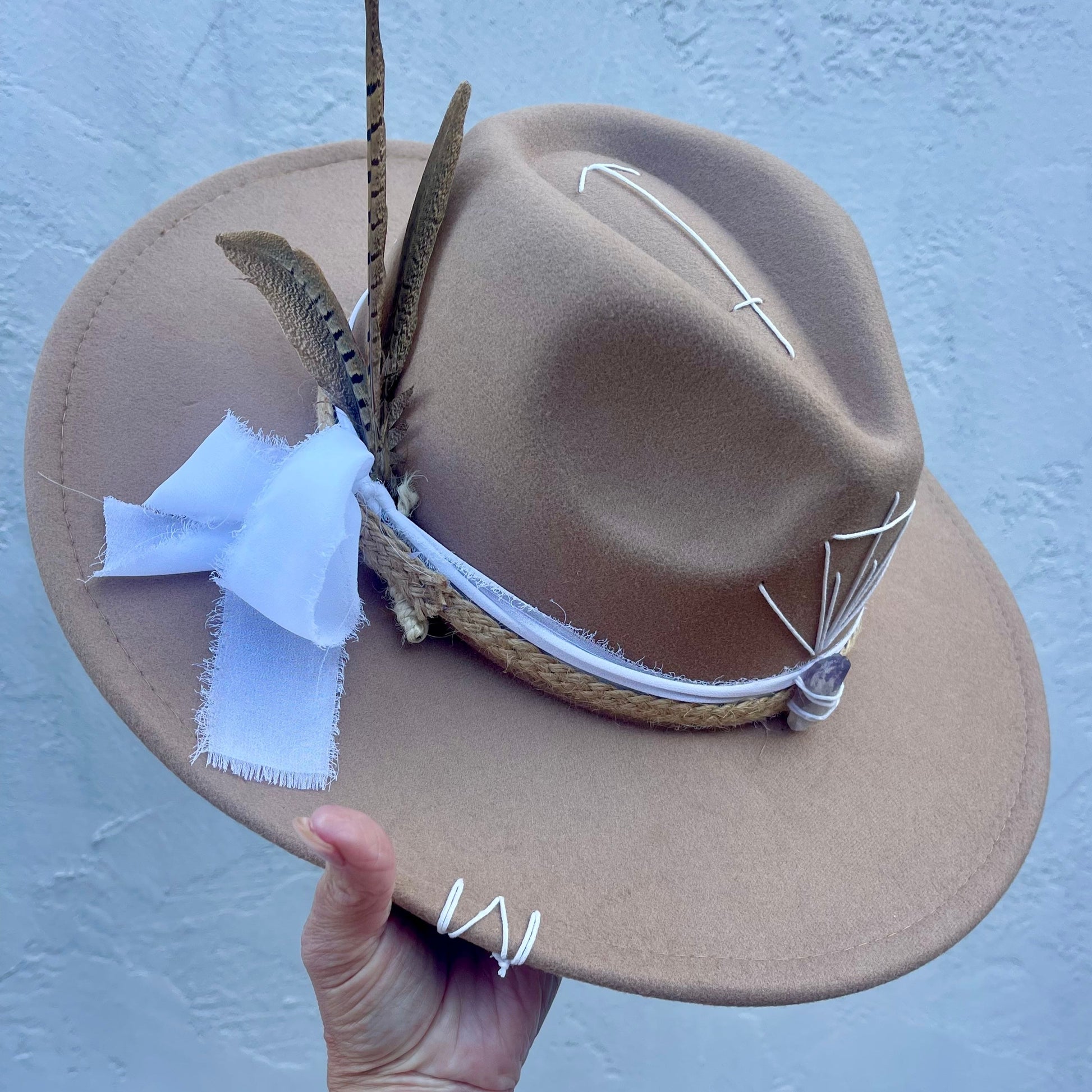 A hat that speaks to the soul. Seta da Alma (“Arrow of the Soul” in Portuguese) is a wide-brim felt fedora featuring hand-stitched linear embroidery that symbolizes alignment and direction. An upward arrow graces the crown, while structured rays fan outward from a Amethyst, grounding the design in balance and clarity. Finished with a natural rope band & white ribbon, this piece blends earthy elegance with spiritual intention — a statement hat for the free-spirited dreamer who walks her own path.